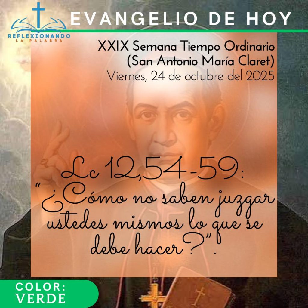 Memoria Libre: San Antonio María Claret, Obispo Viernes, 24 de octubre del 2025 Color: VERDE o BLANCO Primera Lectura. Rom 7,18-25a: “Cuando quiero hacer lo bueno, me encuentro inevitablemente con lo malo en las manos”. Salmo responsorial: 118,66.68.76.77.93.94: “Instrúyeme, Señor, en tus leyes”. Evangelio. Lc 12,54-59: “¿Cómo no saben juzgar …