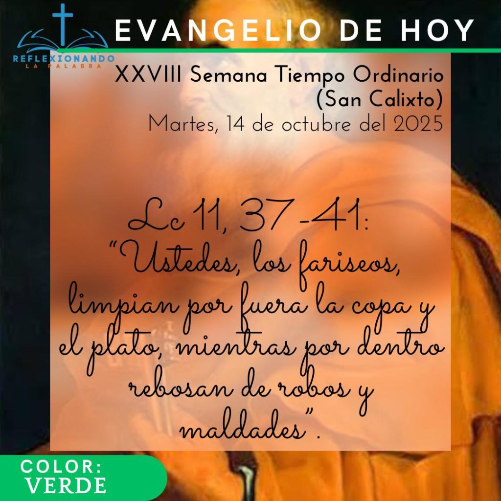 - Evangelio. Lc 11, 37-41: “Ustedes, los fariseos, limpian por fuera la copa y el plato, mientras por dentro rebosan de robos y maldades”.