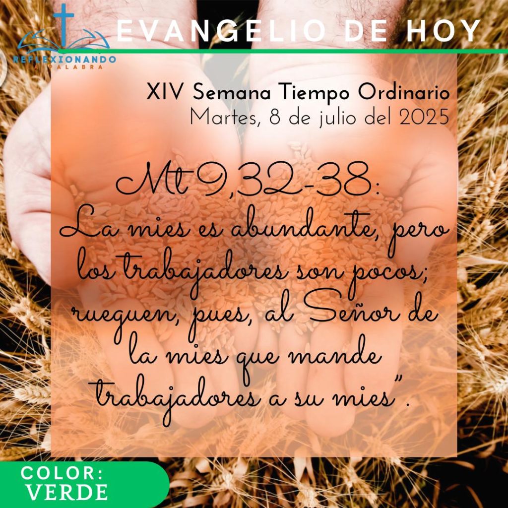 • Evangelio. Mt 9,32-38: «La mies es abundante, pero los trabajadores son pocos; rueguen, pues, al Señor de la mies que mande trabajadores a su mies”.