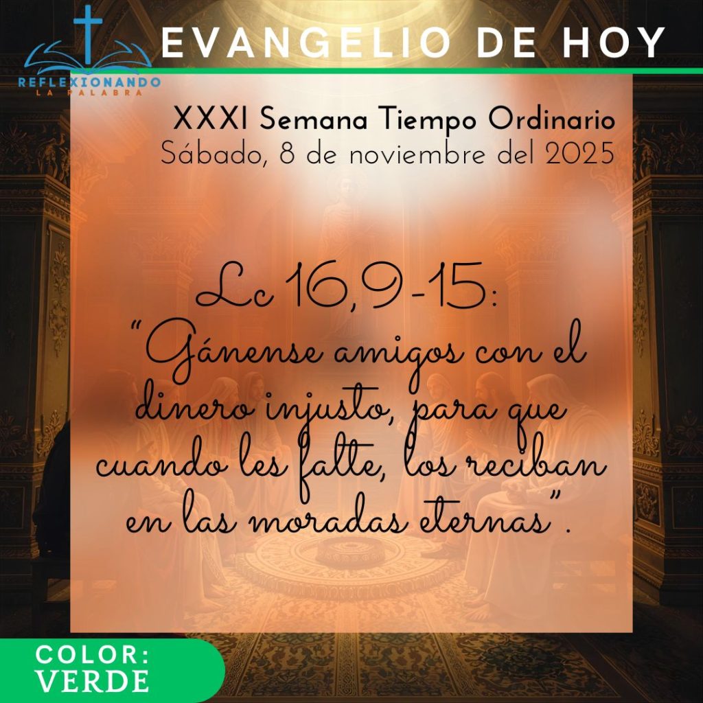 Sábado, 8 de noviembre del 2025 Lecturas: Dedicación de la Basílica de San Juan de Letrán Color: VERDE Primera Lectura. Rom 16,3-9.16.22-27: “Saludos a Prisca y Aquila, colaboradores míos en la obra de Cristo Jesús”. Salmo responsorial: 144, 2-3.4-5.10-11: “Bendeciré tu nombre por siempre, Dios mío, mi Rey”. Evangelio. Lc 16,9-15: …